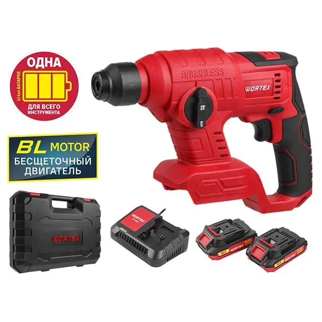 Перфоратор аккумуляторный WORTEX CRH 1810 купить в Гродно с 2-мя АКБ на 2.0 Ач имеет бесщеточный двигатель, что продлевает срок службы инструмента в 2 раза, делает его на 30% мощнее при меньших размерах и весе, позволяет работать до 50% дольше на одном заряде аккумулятора. Малый вес и компактные размеры делают данный перфоратор незаменимым при работе в труднодоступных местах без внешнего источника питания.
