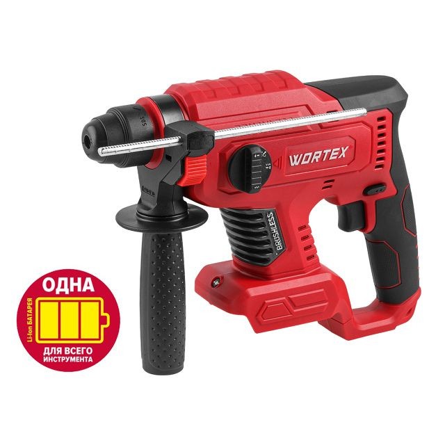 Малый вес и компактные размеры делают данный перфоратор незаменимым при работе в труднодоступных местах без внешнего источника питания. Имеет три режима работы: сверление, сверление с ударом, долбление, а также функцию регулировки угла оснастки (механическое управление). Оснащен подсветкой, реверсом, эргономичной прорезиненной рукояткой. Инструмент входит в линейку WORTEX ALL1 на одном аккумуляторе, которая представлена более чем 50 моделями.