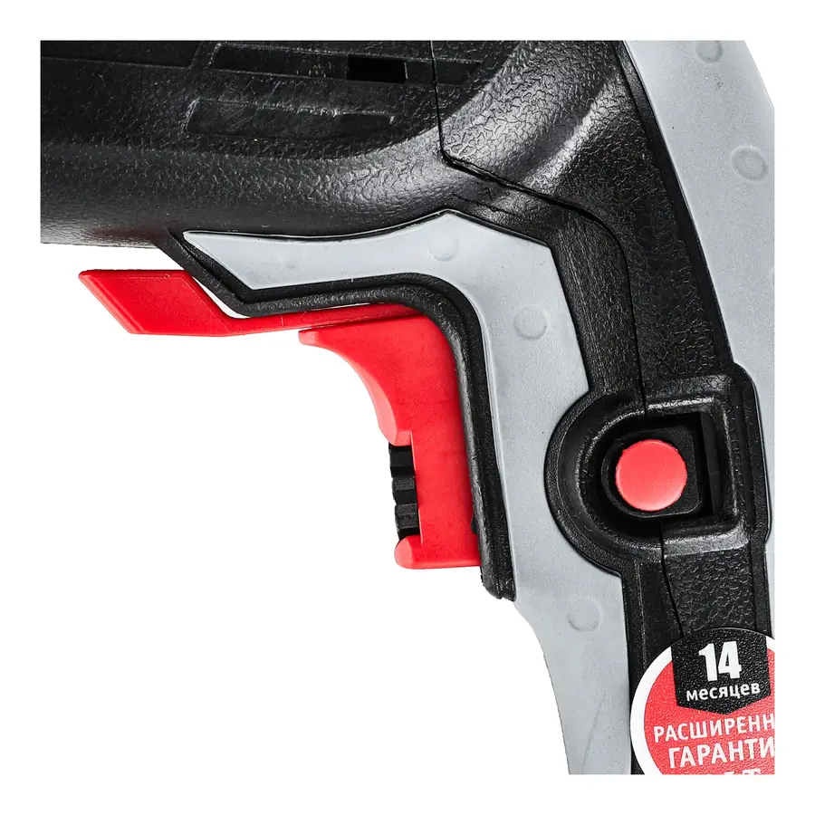 Регулятор находится на кнопке пуска. Поворачивается вправо/влево, за счет этого и происходит регулировка оборотов. Функция фиксации кнопки пуска в рабочем положении — полезна при длительной работе. Функция реверса. Мощный электродвигатель. Дополнительная рукоятка. Пластиковый кейс, набор буров.