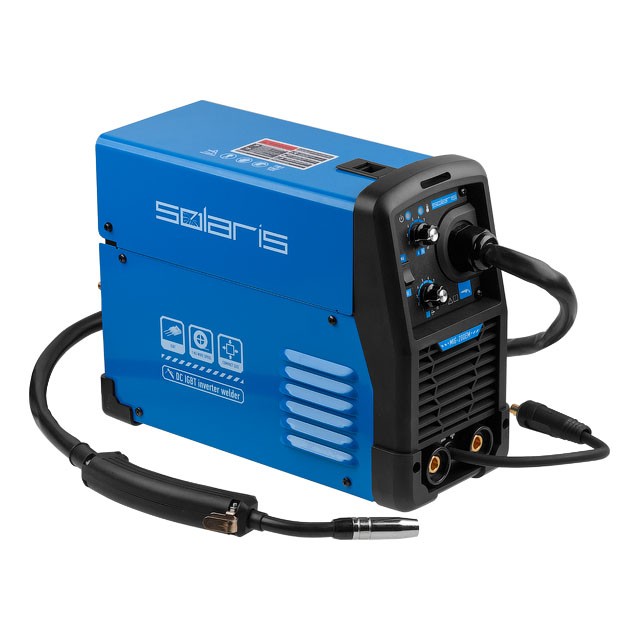 Сварочный полуавтомат SOLARIS MIG-200EM купить в Гродно инверторный в компактном корпусе позволяющий варить в режиме полуавтоматической (MIG/MAG/FLUX) сварки, а также в режиме ручной дуговой (ММА) сварки. Аппарат оснащен встроенной горелкой и возможностью смены полярности для сварки проволокой без газа (FLUX). За счет компактного расположения механизма подачи проволоки (сверху), аппарат сравним в размерах с инверторами для ручной сварки.